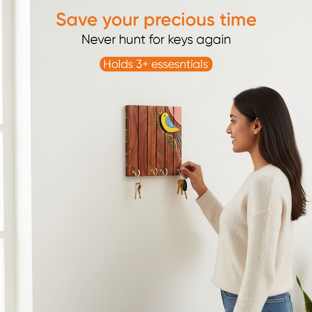 Robin Hand Painted Wooden Key Holder, Wall Mounted Bird Design Key Hanger for Entryway and Homedecor