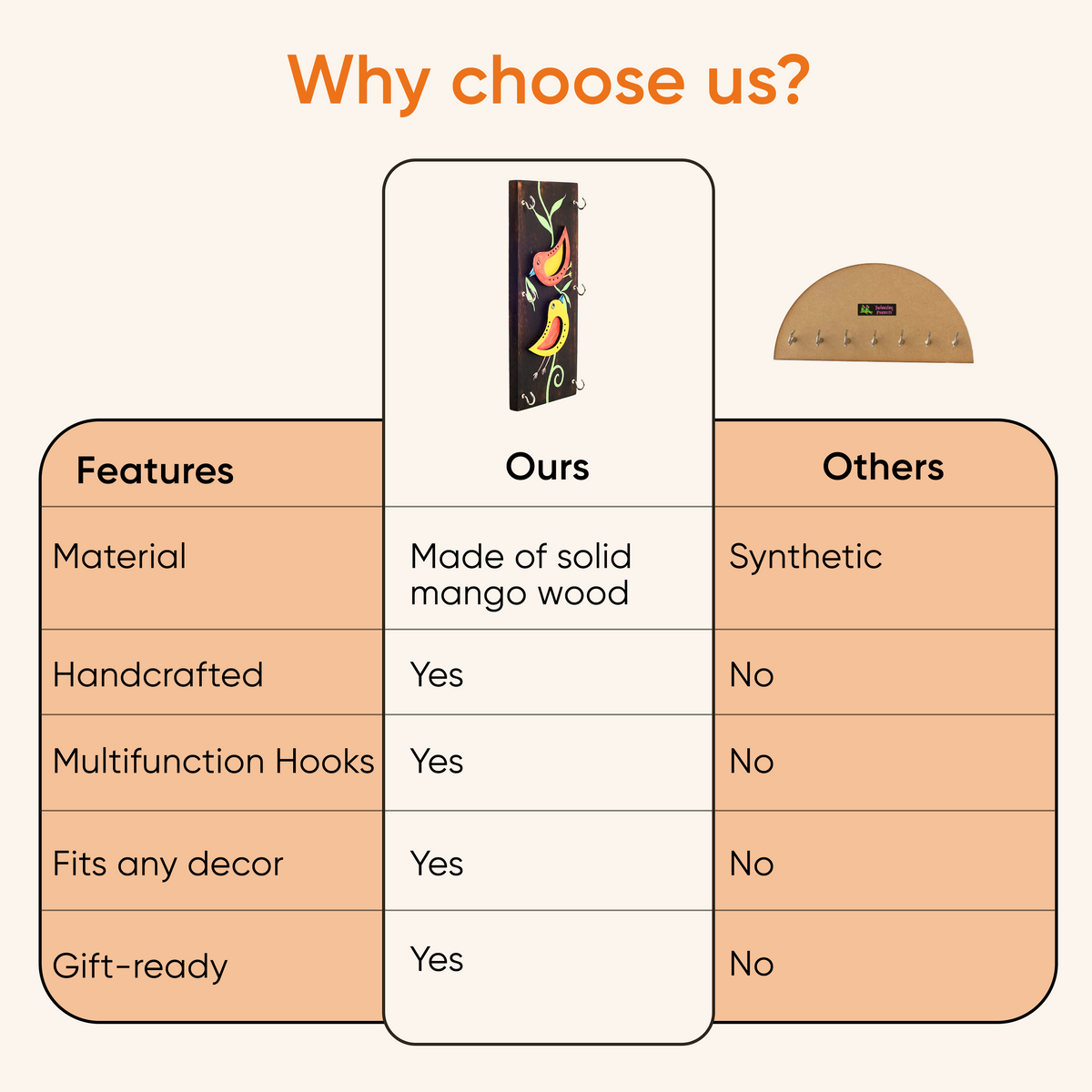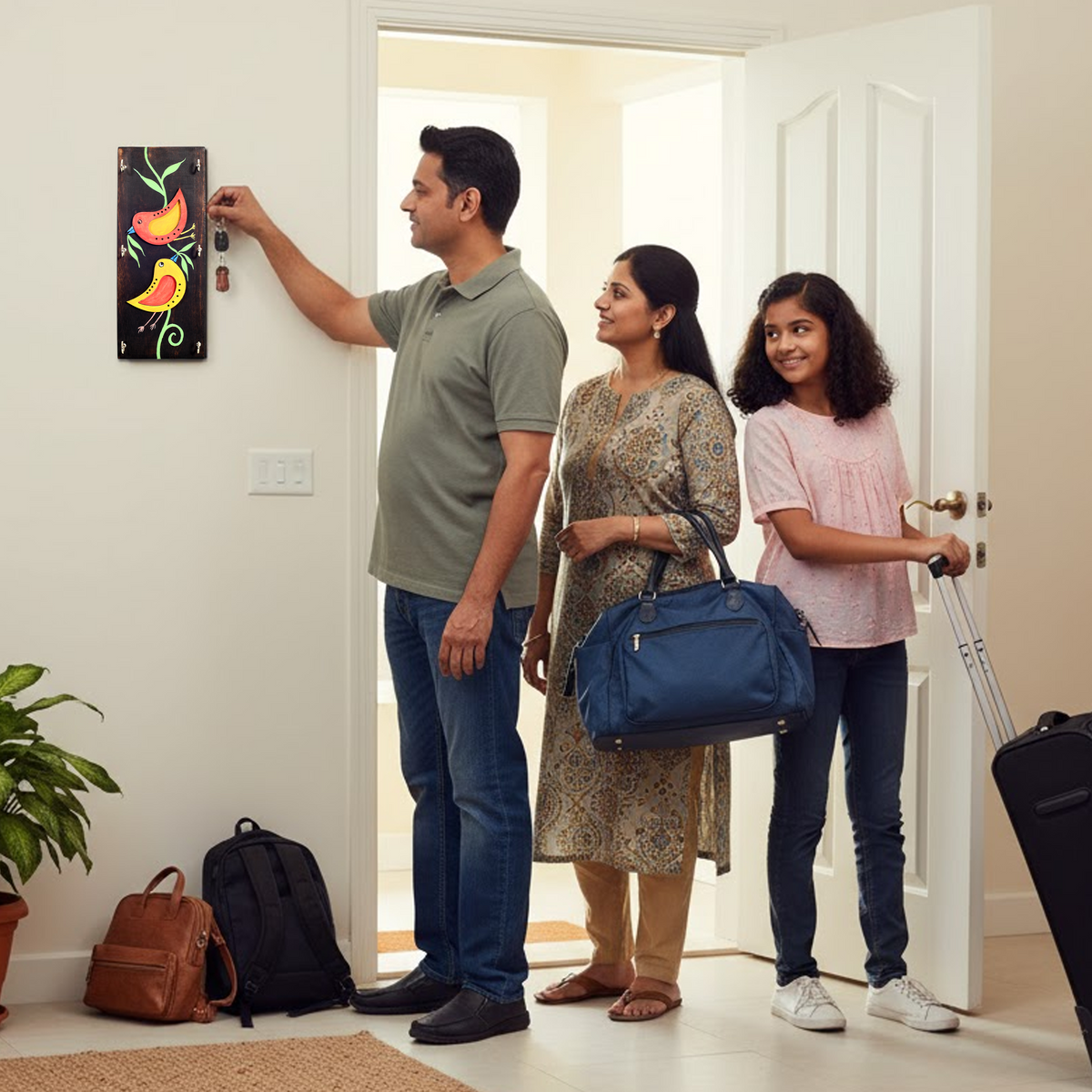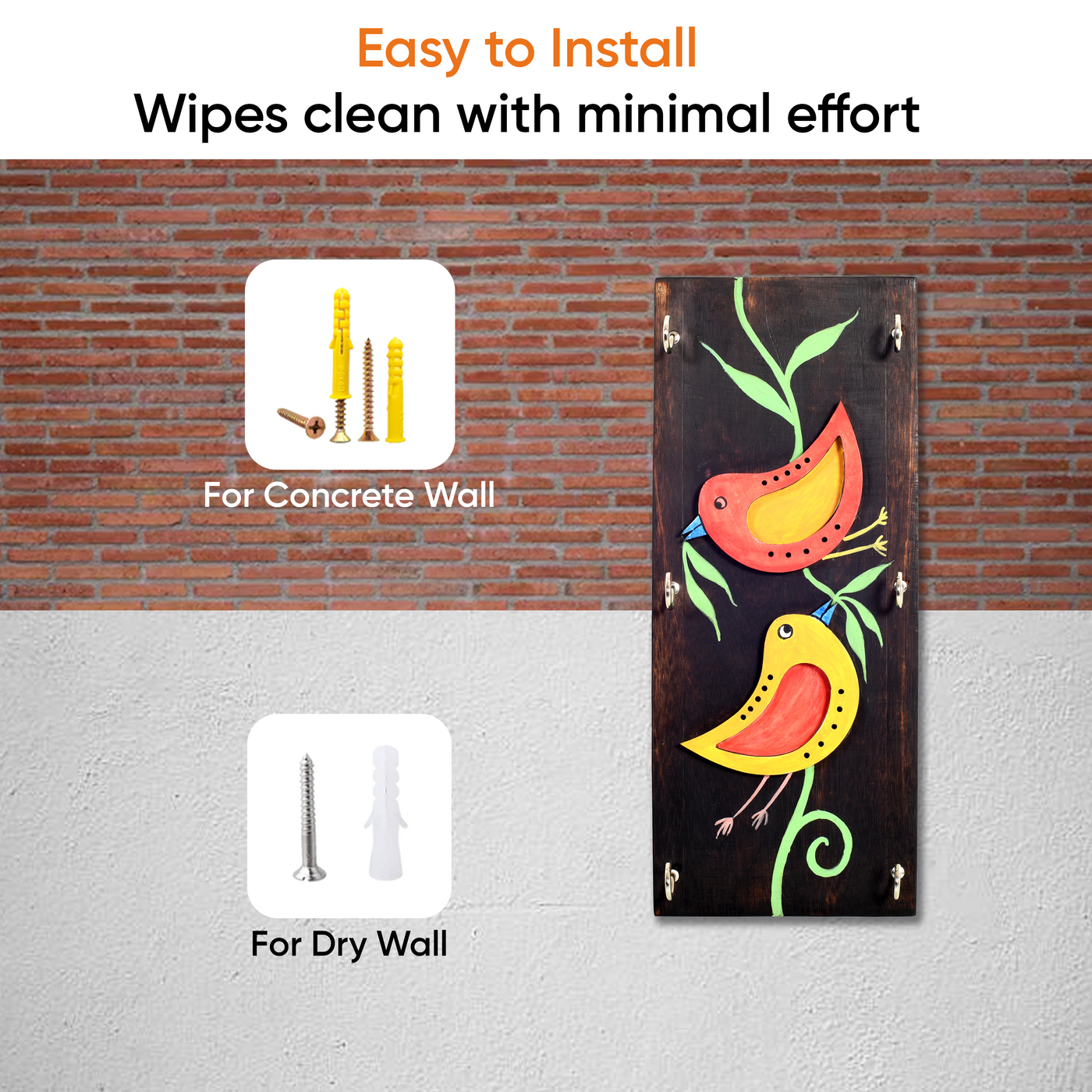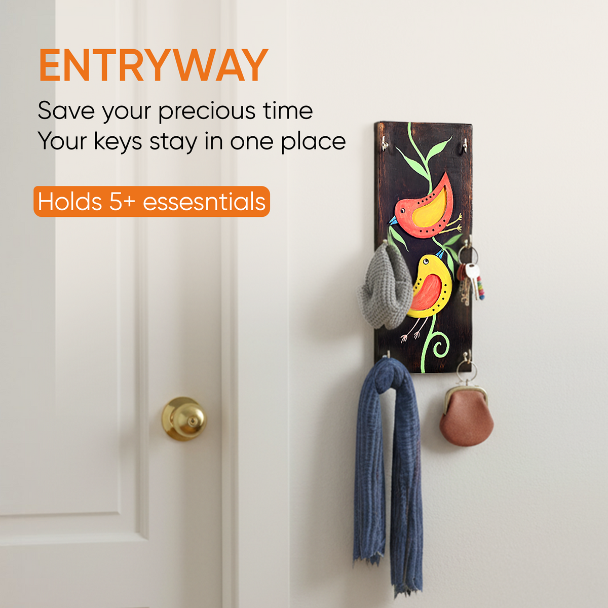 Brighten up your walls with the playful charm of the Ini Mini Hand-Painted Wooden Key Holder. Featuring two adorable birds painted in vibrant hues on a dark wood base, this vertical wall-mounted key hanger is a delightful mix of function and folk-inspired art. Perfect for compact spaces, it offers a stylish way to keep your keys and small accessories organized.