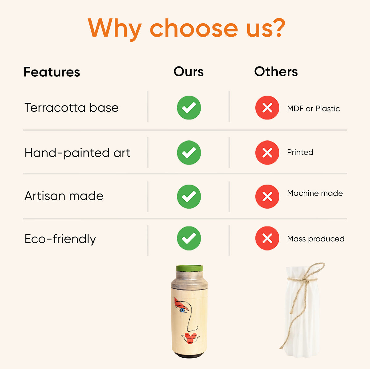 Bring natural beauty and timeless elegance to your spaces with our collection of Handcrafted Vases. Designed using premium materials like terracotta, ceramic, and wood, each vase showcases exceptional craftsmanship and artistic detailing. Perfect for displaying fresh flowers, dried arrangements, or as standalone décor pieces, our vases add a touch of sophistication to any room. Whether you prefer earthy textures, modern shapes, or traditional hand-painted designs, our curated collection offers something to suit every style and mood.